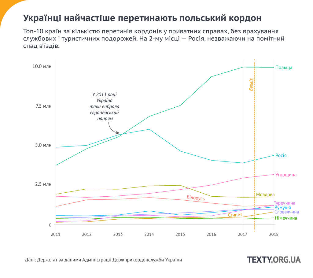 Найчастіше наші громадяни їдуть до Польщі, Угорщини, Румунії, Словаччини, Італії і Німеччини. Кордони