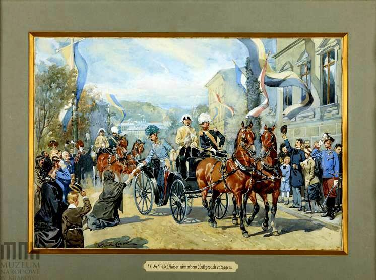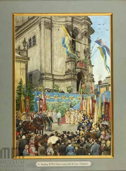 у Львові, здійснюючи інспекцію у вересні 1880. Вгорі картини зображена жовто-блакитна (вертикальна) хоругва,