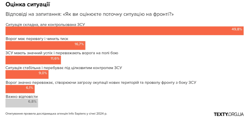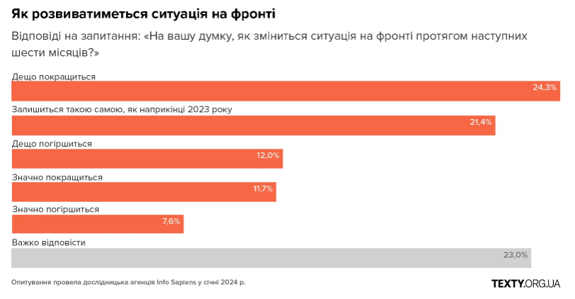 Поточну ситуацію на фронті оцінювали переважно оптимістично, але щодо майбутнього розвитку подій і того, як ідуть справи в Україні, кожен четвертий українець утримувався від відповіді.