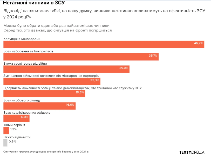 Серед тих, хто негативно оцінює майбутню ситуацію на фронті, майже половина повʼязує це з корупцією і лише 6% каже про брак кваліфікованих офіцерів.