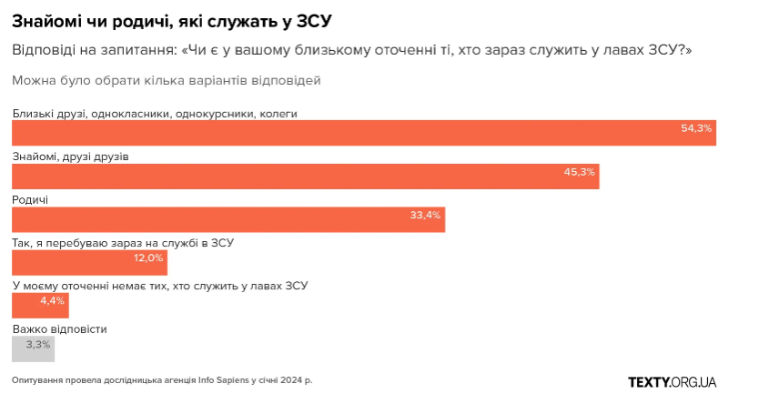 опитаних знають когось, хто служить у ЗСУ, і лише 4% не має в армії ні родичів,
