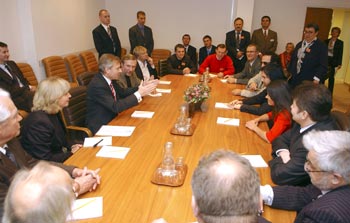 Львів’яни побували у штаб-квартирі НАТО21 листопада 2005 Група українських інтелектуалів, публічних діячів та музикантів, в складі якої була велика частина львів’ян – Руслана, Славко Вакарчук, Олександр Ксенофонтов, Тарас Возняк, Юрко Покальчук та Володимир Цибулько, 16-18 листопада цього року відвідала штаб-квартиру НАТО. Про це сьогодні під час прес-конференції повідомив народний депутат України, член фракції УНП Володимир Цибулько. Саме ця група людей була відібрана для того, аби проводити в Україні роз’яснювальну кампанію щодо діяльності НАТО, оскільки в Україні рівень довіри до політиків є значно нижчим, ніж до незалежних від політики людей. „Верхівка НАТО хоче говорити не тільки до української еліти, але й до низів, до простих людей”, - зазначив Володимир Цибулько. Як повідомив головний редактор Незалежного культурологічного часопису „Ї” Тарас Возняк, унікальність поїздки в тому, що була організована зустріч українців з Генеральним секретарем НАТО. Крім цього відбулися зустрічі з представниками Департаменту із міжнародних справ НАТО, з трьома послами при НАТО – Нідерландів, Словаччини і Литви, під час яких члени української делегації задавали досить „гострі” питання щодо політики НАТО в Косово, Боснії і Герцоговини, Росії.