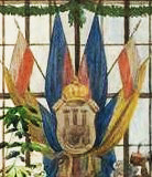 на якій головний колір (жовтий) зліва. Над аркою, з лівої сторони, чорно- жовта хоругва